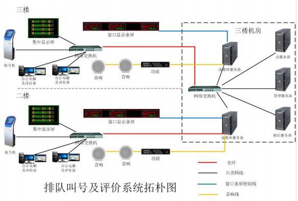 一樓、三樓辦事大廳各設(shè)置為一個(gè)叫號(hào)區(qū)域配套大屏幕電視機(jī)。一樓、三樓區(qū)域安裝取票機(jī) 1 臺(tái),二 樓區(qū)域安裝取票機(jī) 2 臺(tái)。各配套大屏幕電視機(jī)進(jìn)行信息集中顯示,以及音響系統(tǒng)進(jìn)行語音提示。各區(qū)域根