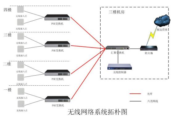 無線網(wǎng)絡(luò)采用無線接入點(diǎn)(AP) +無線控制器(AC) 的企業(yè)級(jí)無線網(wǎng)絡(luò)系統(tǒng)架構(gòu),星型拓?fù)浣Y(jié)構(gòu)。在